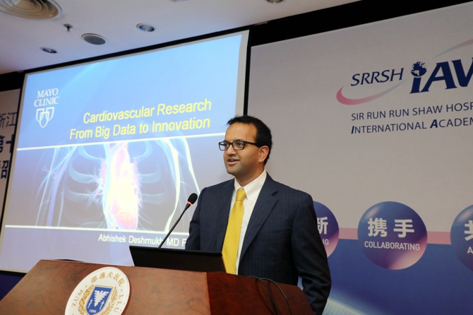 大会首先由Abhishek Deshmukh医生作“心血管研究——从大数据到创新”的报告。他以梅奥医学中心的价值理念“病人至上”切入,指出为病人提供最先进的医疗服务所需要的医疗质量、教育、研究三者都指向创新,鼓励大家在临床医疗挑战中为创新创造机会。他还通过未来心电图判读技术,心电图人工智能(AI)引导下的低射血分数筛查,无血监测高钾血症等临床新思路、新实践引导医生树立创新理念,以问题为导向,不断提升科技创新、转化实践的能力。