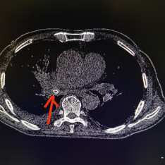 之后,李老伯持续发热不退,直到出现比较重的胸闷症状,再次到医院就诊,做了胸部CT后,医生发现,李老伯右肺中间支气管被一颗大约1cm*1cm大小的杨梅核堵住了(人体右肺中间支气管直径也就1厘米-1.2厘米,杨梅核相当于完全卡在了支气管内),并且出现了大片的阻塞性肺炎和炎性胸腔积液。这时,距离李老伯吞下这颗杨梅核,已经过去了16天。